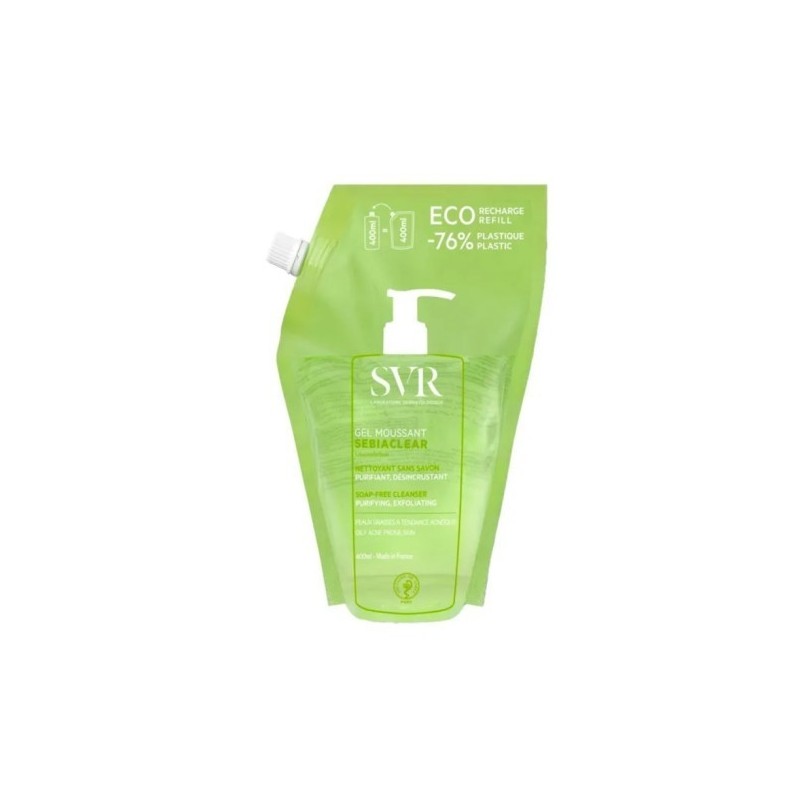 Svr sebiaclear gel moussant eco-pack es un limpiador sin jabón que purifica y desincrusta suavemente la piel. Su espuma cremosa ayuda a eliminar las impurezas y deshacerse del exceso de sebo sin resecar. Fácil de aclarar, deja la piel perfectamente limpia, fresca y matificada.