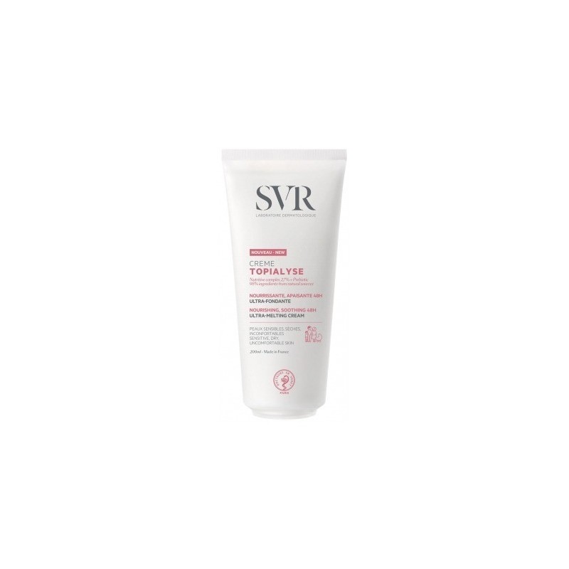 SVR Topialyse Crema Nutritiva Calmante 48H 200 ml es una crema para pieles sensibles, secas y con molestias. Es un cuidado nutritivo que puede utilizar toda la familia, con una delicada fragancia y una eficacia de 48 horas.